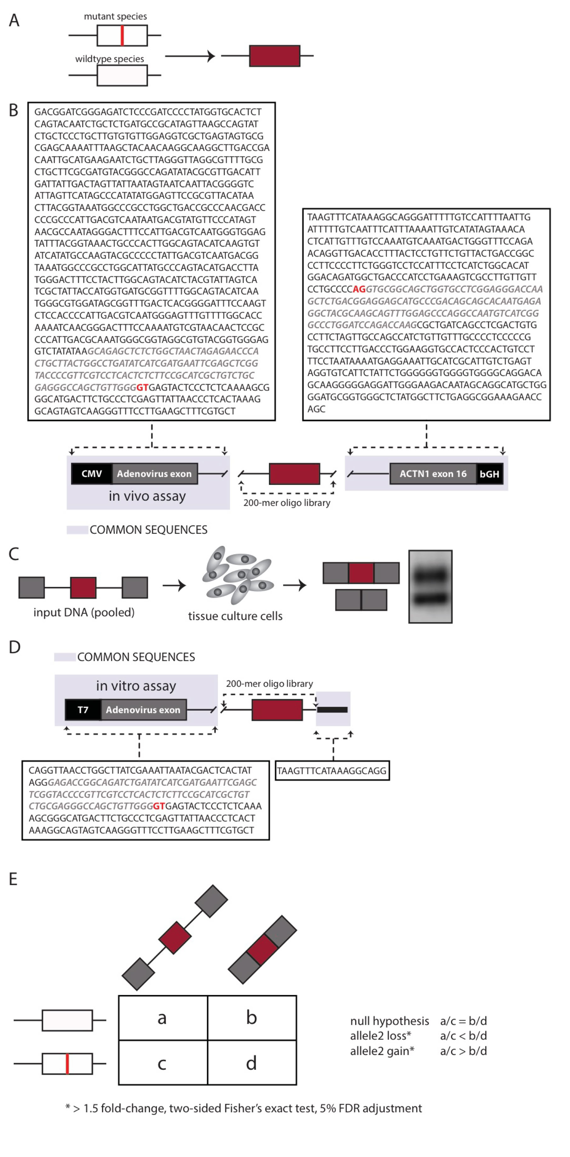 Nonsynonymous mutations classified as disease-causing (DM) were downloaded from HGMD. Mutations were mapped to internal exons ≤ 100 nucleotides in length and selected for those that fit into 170 nucleotide genomic windows, which include 15 nucleotides of downstream intronic sequence and ≥ 55 nucleotides of upstream intronic sequence (for a total of 4,964 variants). The mutant and wildtype versions of the 170-mer genomic fragments were flanked with 15-mer common primers and synthesized as a 200-mer oligo library (Figure 1A).