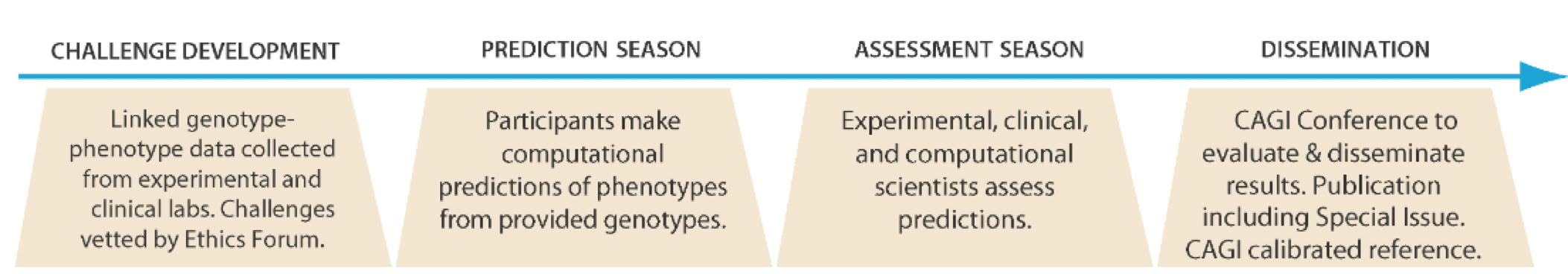 How does CAGI work? CAGI experiment participants are provided genetic variants and make predictions about resulting phenotypes. Independent assessors evaluate the predictions against experimentally characterized phenotypes. The experiment culminates in the CAGI Conference with publications in a special journal issue.